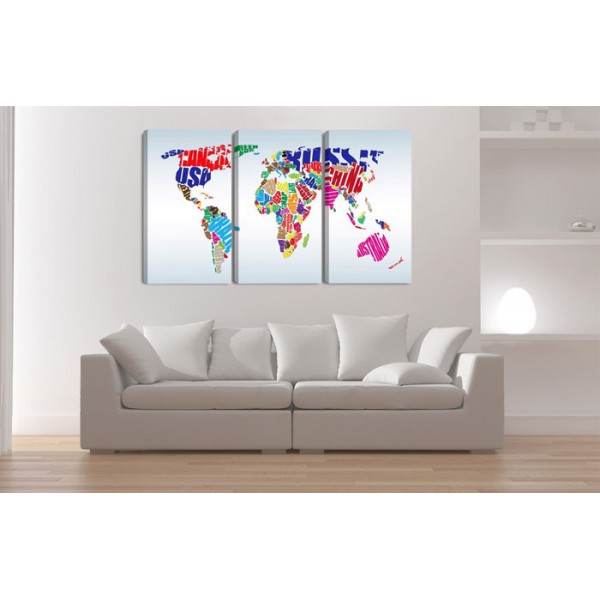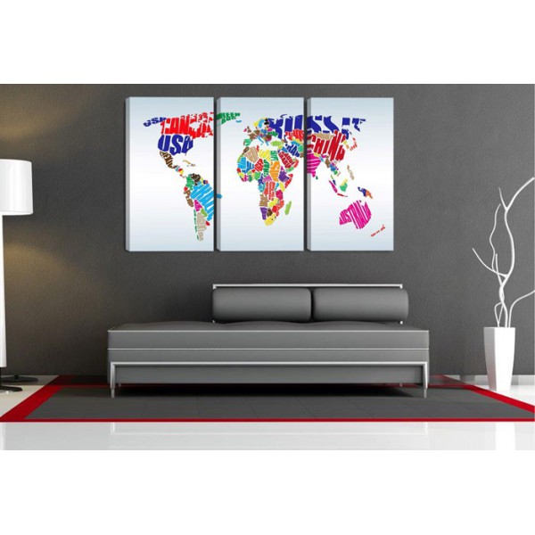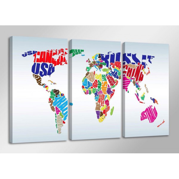 Cuadro lienzo con motivo Mapa Mundo compuesto de 3 partes de medidas 160x90 cm aproximadamente en total, tal y como se ve en las fotografías. Impresión sobre lienzo de altísima calidad. Grosor del bastidor 2 cm. El artículo es nuevo, en su embalaje original, y puede colgarse directamente sin necesidad de ningún marco.