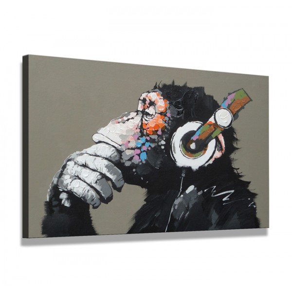 Cuadro lienzo con motivo mono con auriculares compuesto de 1 parte de medidas 80x60 cml, tal y como se ve en las fotografías. Impresión sobre lienzo de altísima calidad. Grosor del bastidor 2 cm. El artículo es nuevo, en su embalaje original, y puede colgarse directamente sin necesidad de ningún marco.