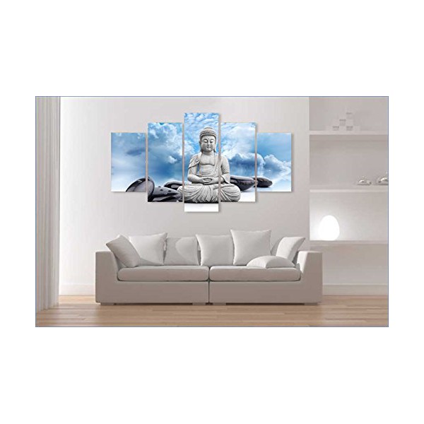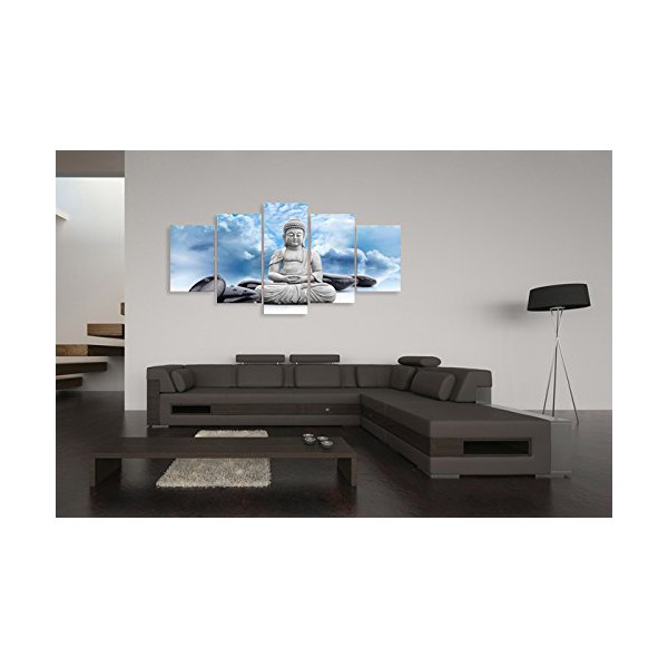 Cuadro lienzo con motivo Buda compuesto de 5 partes de medidas 200x100 cm aproximadamente en total, tal y como se ve en las fotografías. Impresión sobre lienzo de altísima calidad. Grosor del bastidor 2 cm. El artículo es nuevo, en su embalaje original, y puede colgarse directamente sin necesidad de ningún marco.