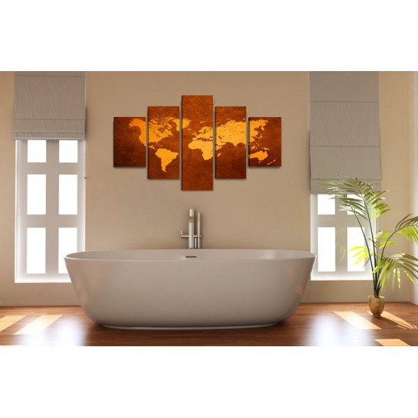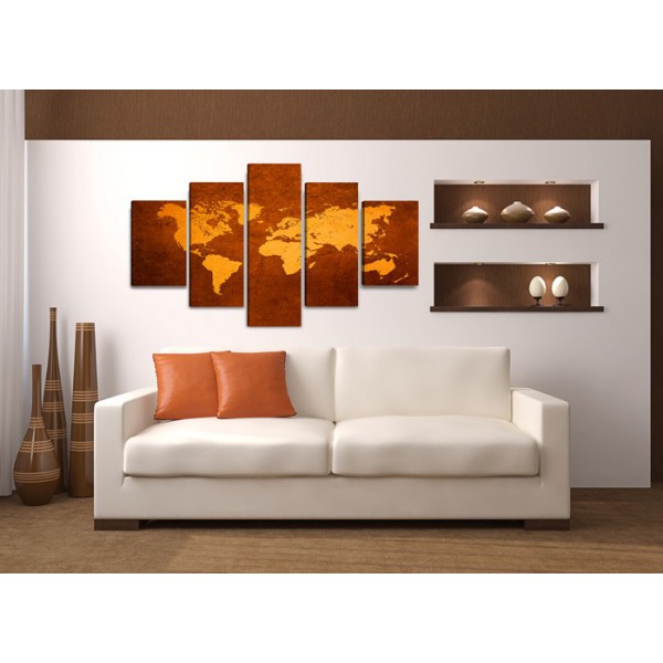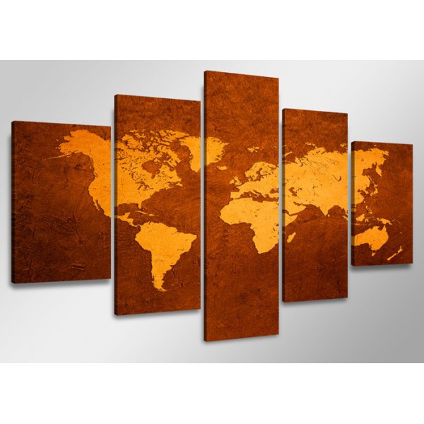Cuadro lienzo con motivo del mapa del mundo compuesto de 5 partes de medidas 160x80 cm aproximadamente en total, tal y como se ve en las fotografías. Impresión sobre lienzo de altísima calidad. Grosor del bastidor 2 cm. El artículo es nuevo, en su embalaje original, y puede colgarse directamente sin necesidad de ningún marco.