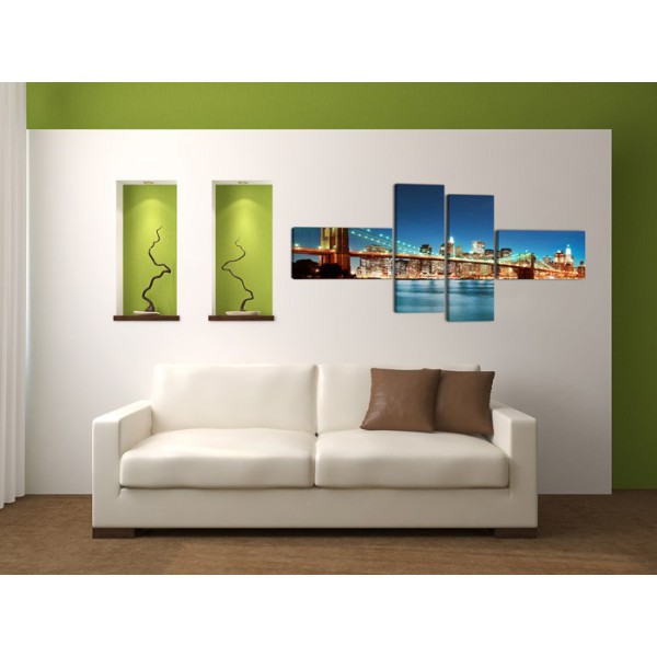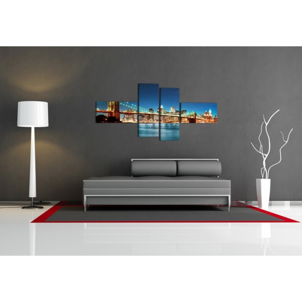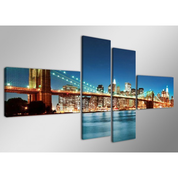 Cuadro lienzo con motivo ciudad de New York compuesto de 4 partes de medidas 160x70 cm aproximadamente en total, tal y como se ve en las fotografías. Impresión sobre lienzo de altísima calidad. Grosor del bastidor 2 cm. El artículo es nuevo, en su embalaje original, y puede colgarse directamente sin necesidad de ningún marco.