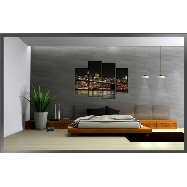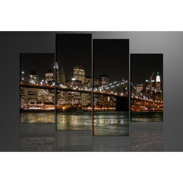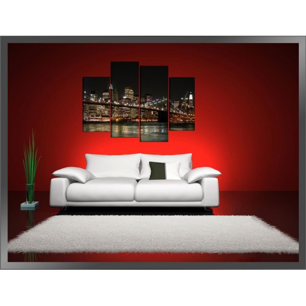 Cuadro lienzo con motivo ciudad de New York compuesto de 4 partes de medidas 130x80 cm aproximadamente en total, tal y como se ve en las fotografías. Impresión sobre lienzo de altísima calidad. Grosor del bastidor 2 cm. El artículo es nuevo, en su embalaje original, y puede colgarse directamente sin necesidad de ningún marco.
