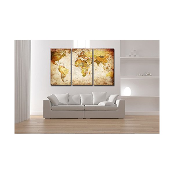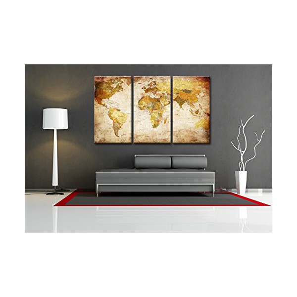 Cuadro lienzo con motivo Mapa Mundo compuesto de 3 partes de medidas 160x90 cm aproximadamente en total, tal y como se ve en las fotografías. Impresión sobre lienzo de altísima calidad. Grosor del bastidor 2 cm. El artículo es nuevo, en su embalaje original, y puede colgarse directamente sin necesidad de ningún marco.