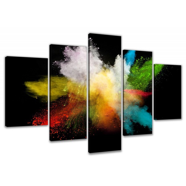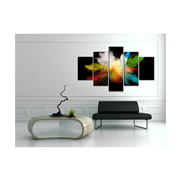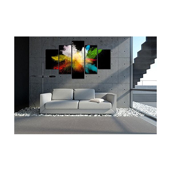 Cuadro lienzo con motivo Pinturas compuesto de 5 partes de medidas 200x100 cm aproximadamente en total, tal y como se ve en las fotografías. Impresión sobre lienzo de altísima calidad. Grosor del bastidor 2 cm. El artículo es nuevo, en su embalaje original, y puede colgarse directamente sin necesidad de ningún marco.