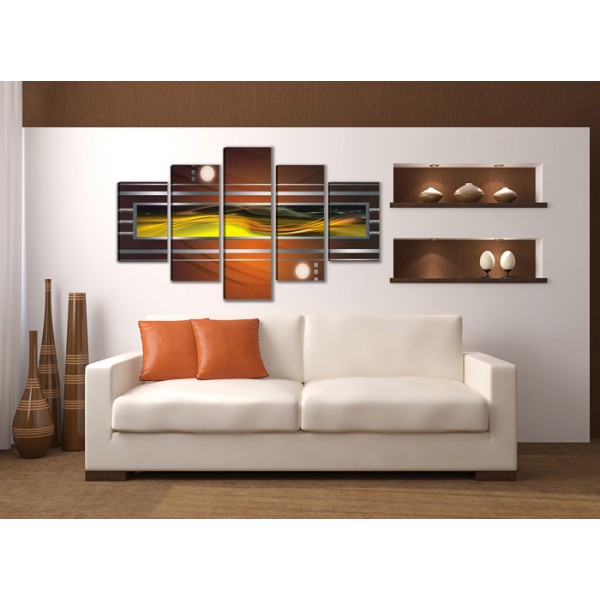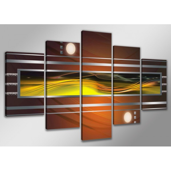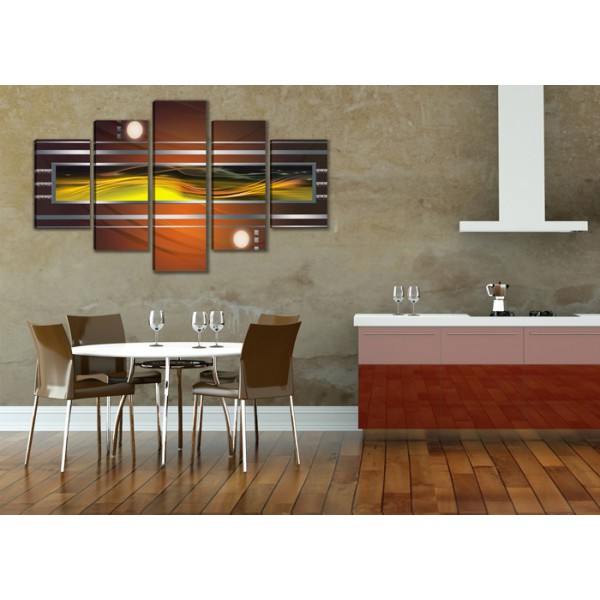 Cuadro lienzo con motivo moderno compuesto de 5 partes de medidas 160x80 cm aproximadamente en total, tal y como se ve en las fotografías.