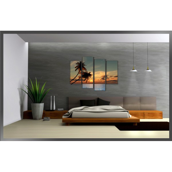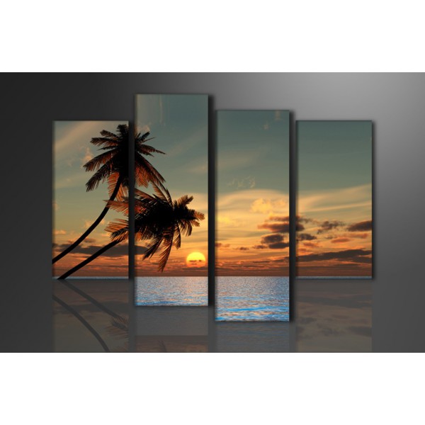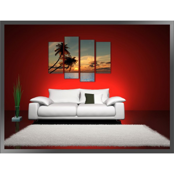 Cuadro lienzo con motivo paraiso compuesto de 4 partes de medidas 130x80 cm aproximadamente en total, tal y como se ve en las fotografías. Impresión sobre lienzo de altísima calidad. Grosor del bastidor 2 cm. El artículo es nuevo, en su embalaje original, y puede colgarse directamente sin necesidad de ningún marco.