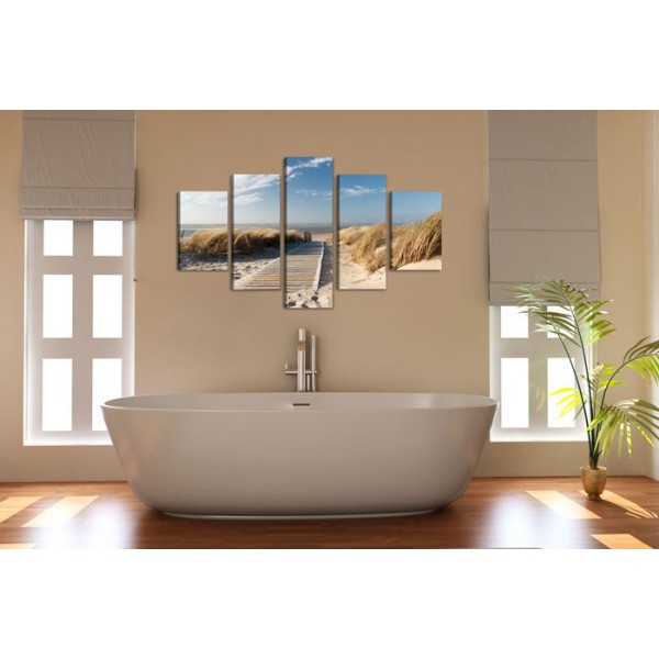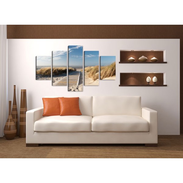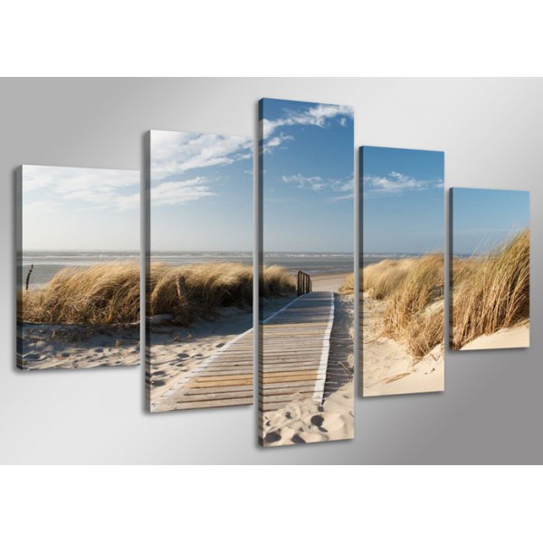 Cuadro lienzo con motivo paisajístico compuesto de 5 partes de medidas 160x80 cm aproximadamente en total, tal y como se ve en las fotografías. Impresión sobre lienzo de altísima calidad. Grosor del bastidor 2 cm. El artículo es nuevo, en su embalaje original, y puede colgarse directamente sin necesidad de ningún marco.