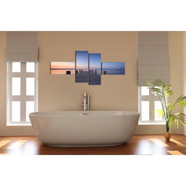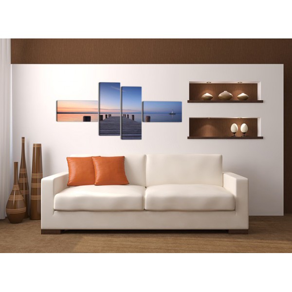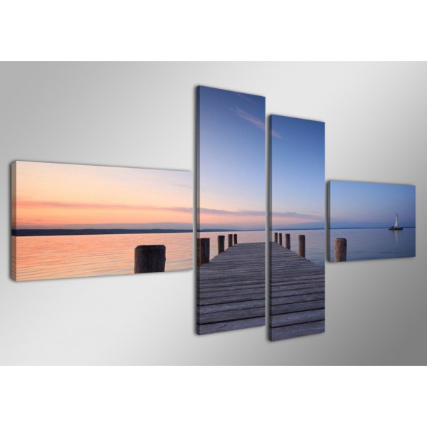 Cuadro lienzo con motivo embarcadero compuesto de 4 partes de medidas 160x70 cm aproximadamente en total, tal y como se ve en las fotografías. Impresión sobre lienzo de altísima calidad. Grosor del bastidor 2 cm. El artículo es nuevo, en su embalaje original, y puede colgarse directamente sin necesidad de ningún marco.