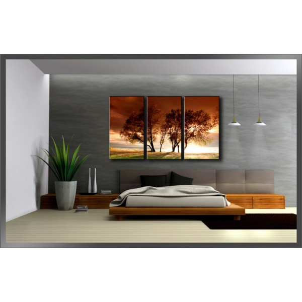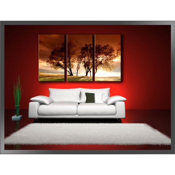 Cuadro lienzo con motivo paisaje compuesto de 3 partes de medidas 160x90 cm aproximadamente en total, tal y como se ve en las fotografías. Impresión sobre lienzo de altísima calidad. Grosor del bastidor 2 cm. El artículo es nuevo, en su embalaje original, y puede colgarse directamente sin necesidad de ningún marco.
